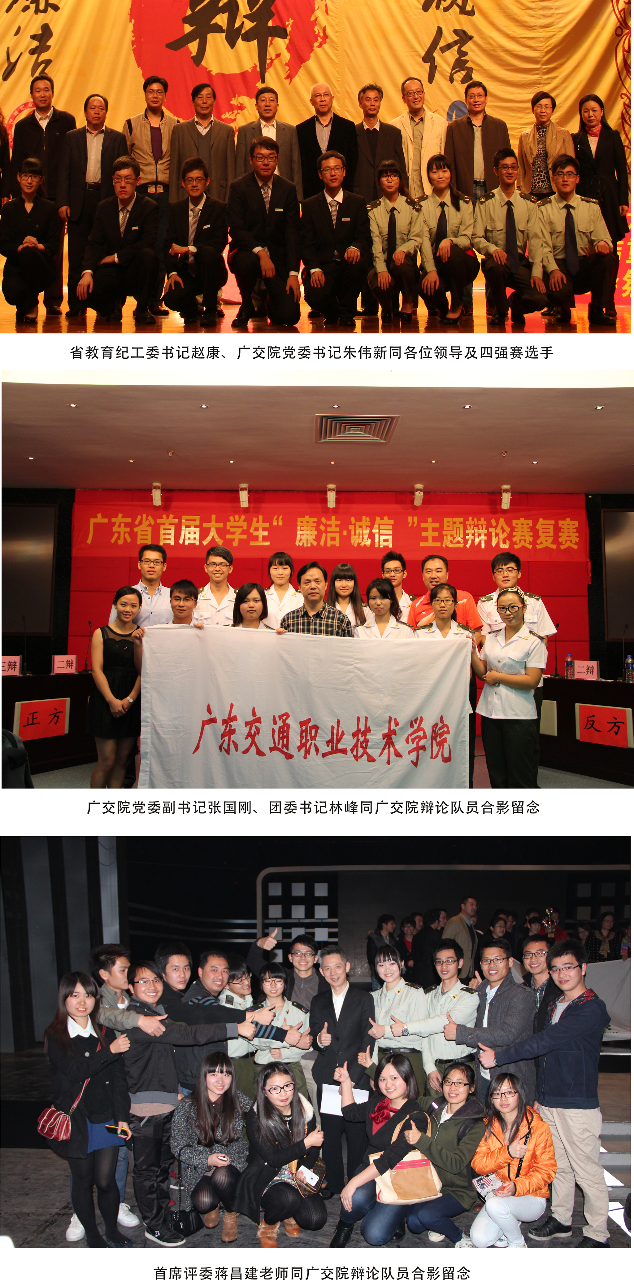 12月27日,广东省首届大学生“廉洁●诚信”主题辩论赛总决赛在广东电视台演播大厅圆满落幕,中山大学、华南理工大学分获冠、亚军,我院获得季军,团委书记林峰同志被评为“最佳指导老师”,刘宋璇、吕游、张耀方被评为赛区、复赛“最佳辩手”。广东省委教育工委书记、省教育厅厅长、党组书记罗伟其,省教育纪工委书记赵康,我院党委书记朱伟新等领导莅临赛事现场,并为获奖选手颁奖,著名辩论员蒋昌建担任本次比赛的首席评委。