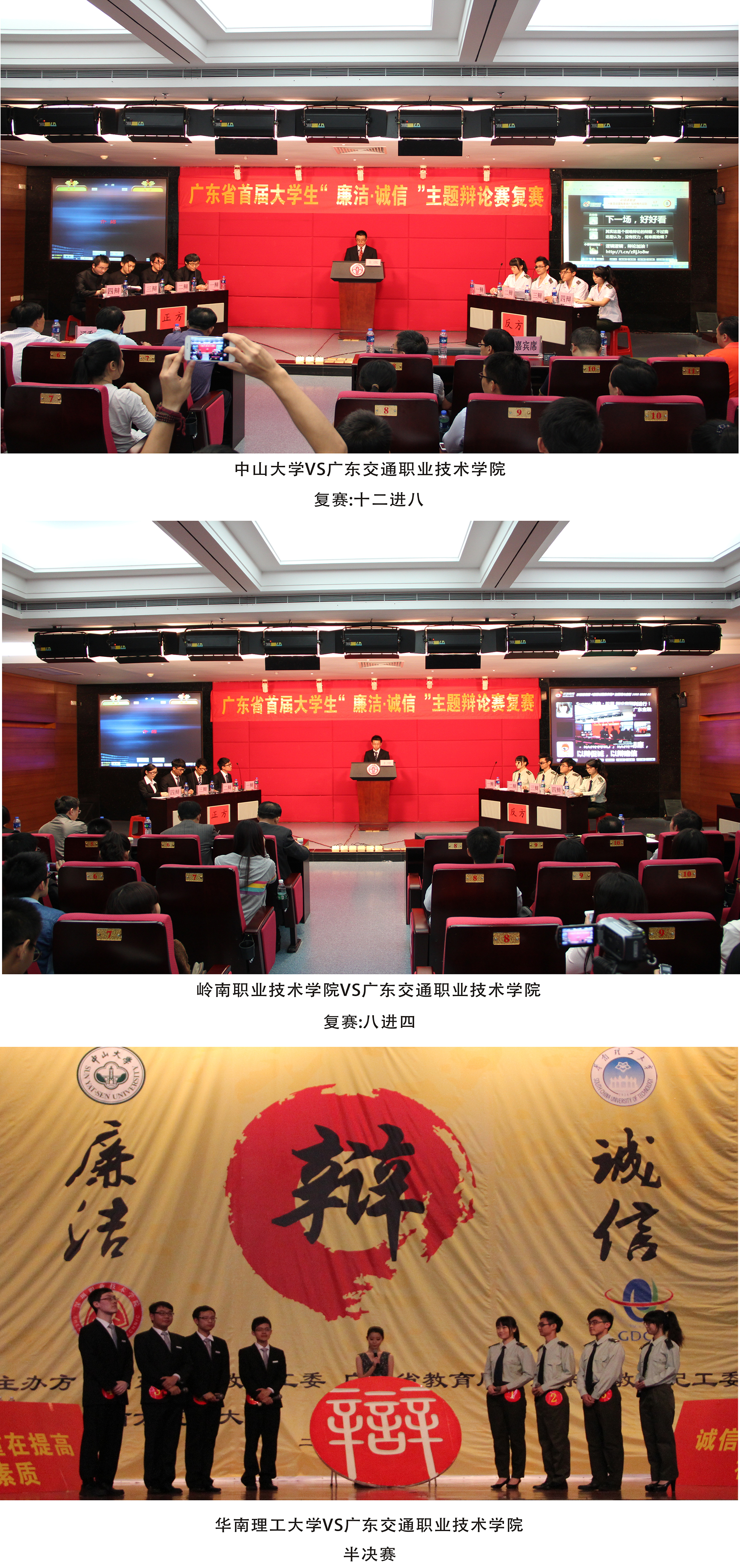 本次辩论赛由省委教育工委、省教育厅、省教育纪工委主办,总决赛由广东交通职业技术学院等三个单位协办,整个赛程持续近四个月,96所大专院校代表队为全省高校师生奉上100余场辩论盛宴,实现了“通过理性思辨引导大学生增强诚信守法和廉洁自律意识,正确看待反腐倡廉问题,同时让廉洁修身观念走出校园、辐射社会,为全社会的党风廉政建设营造良好氛围”的目的。